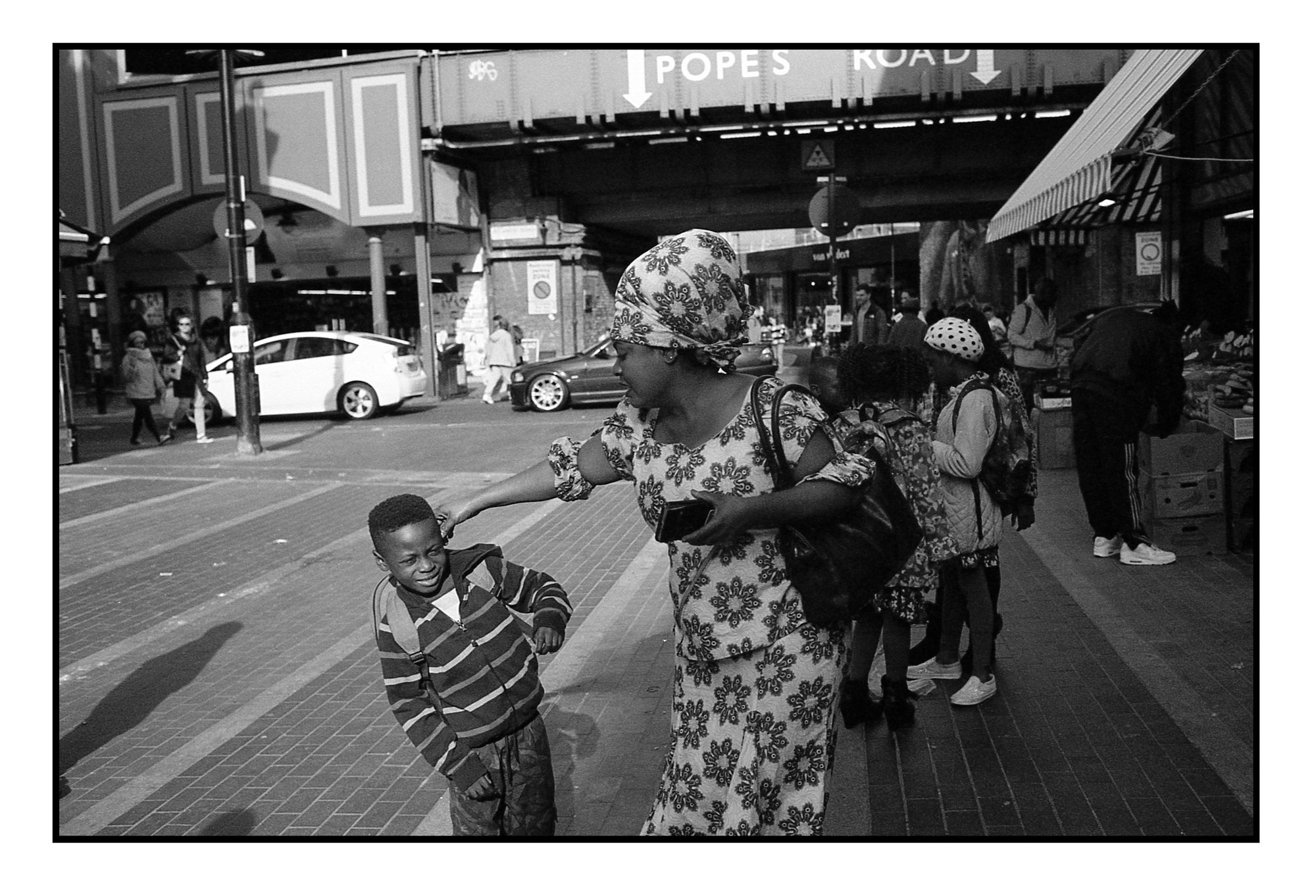 A Brixton scene: A woman appeared on Electric Avenue, and by the time I took notice of her beautiful headdress, she started to reach for her son’s ear. I quickly made two exposures: one of her reaching to grab his ear, one of her pulling him along and into the shadows. This one was my favorite.
